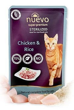 Krmivo Nuevo sterilized drůbeží s rýží je kompletní krmivo pro kastrované kočky všech plemen, obohaceno o drůbeží maso s rýží. Vysoký obsah masa a přírodních surovin, žádné umělé přísady, obiloviny či lepek dělají z tohoto krmiva opravdu vysoce kvalitní pochoutku, kterou si zamilují i ty nejvybíravější kočičky!