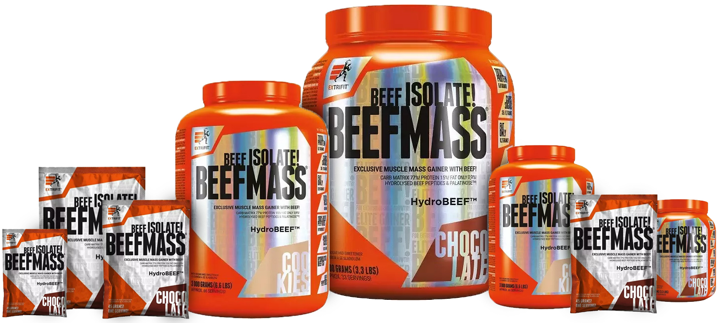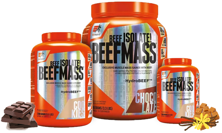 Jistě jste již zaznamenali novou řadu produktů sportovní výživy obsahující značkový hovězí proteinový izolát. Hovězí proteinový izolát HydroBEEF® (hydrolyzované hovězí peptidy) s obsahem 97 % hovězích bílkovin tvoří proteinový základ gaineru BeefMass. Ten jsme doplnili kvalitním matrixem sacharidů pro maximální nárůst síly a svalové hmoty. BeefMass je nový gainer, který obsahuje hydrolyzovanou izolovanou hovězí bílkovinu, jejíž předností je prakticky nulový obsah tuku a cukru. Hovězí proteinový izolát HydroBEEF® je jeden z nejkvalitnějších bílkovinných zdrojů. Užívání hovězí bílkoviny má v silových sportech dlouhou tradici. BeefMass je určen pro všechny, kdo usilují o nárůst svalové hmoty a síly.