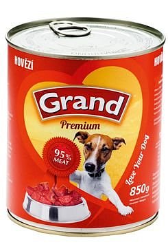 Konzerva GRAND konz. pes hovězí je kompletní krmivo pro psy, vytvořeno z čerstvého masa (min. 60%) bez chemických přísad. Neobsahuje žádné chemické a konzervační přísady ani sóju. Obsahuje podíl vitaminů a aminokyselin v přírodní nepozměněné formě. Do konzerv je přidávána rýžová mouka v maximální míře 0-2 % z důvodu zahuštění masové složky.