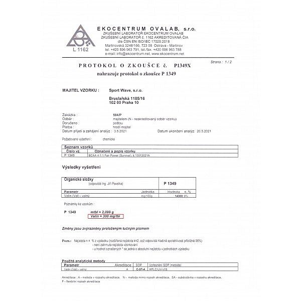 BCAA 4:1:1 Fair Power byly v květnu 2014 testovány Státní zemědělskou a potravinářskou inspekcí. Ta potvrdila, že produkt obsahuje deklarovaná množství volných aminokyselin a také, že produkt neobsahuje žádné zakázané látky. Protokoly kontroly najdete v galerii fotografií produktu.