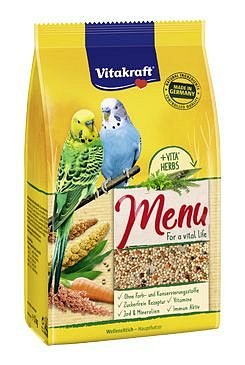 VITAKRAFT Menu je kvalitní směsí krmení pro papoušky. Jedná se o kvalitní potravu s obsahem všech životně důležitých vitamínů. Toto krmivo zajišťuje nejlepší předpoklady pro pevné peří, krásné, přirozené barvy a dlouhý a zdravý život.
