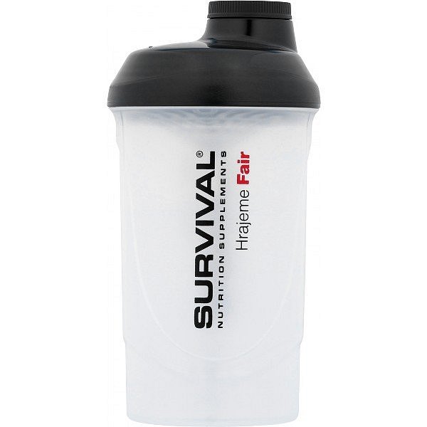 Šejkr Survival je transparentní barvy s černým uzávěrem i malým šroubovacím víčkem. Na šejkru je nápis Survival Hrajeme Fair v černo-červeném provedení. Po stranách jsou rysky v ml/oz pro odměření. Objem šejkru je 600 ml. Šejkr obsahuje mřížku pro lepší rozmíchání nápoje.