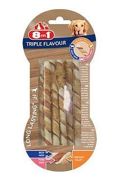 8in1 Triple Flavour lahodné žvýkací kroucené tyčinky jsou vyrobené z vepřové a hovězí kůže obalené kuřecím masem - pro dlouhotrvající zábavu vašeho psa. Dlouhotrvající zábava ze žvýkání redukuje plak a předchází tvorbě zubního kamene.