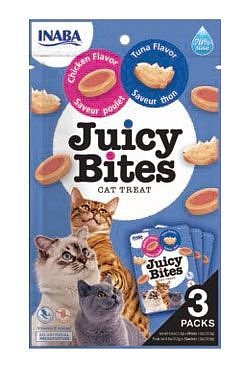 Juicy Bites je neodolatelně lahodná, vlhká odměna, obohacená o přírodní aromata, extrakt ze zeleného čaje a vitamín E v jemné příchuti tuňáka a kuřete. Neobsahuje obilí, konzervační látky ani umělá barviva. Každé balení obsahuje tři samostatné svačinové sáčky pro maximální čerstvost každého z nich. Každé malé balení obsahuje dvě různé, zábavně tvarované a chuťově odlišné svačinky, díky kterým budou vaše koťátka ještě spokojenější.