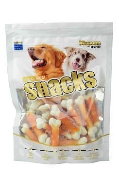 Proužek kuřecí svaloviny namotaný na křupavé kalciové kosti.