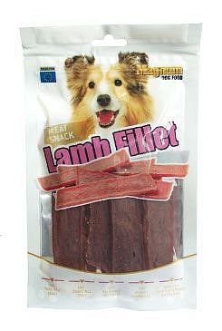 Měkká, přírodní masová pochoutka pro psy s jehněčím masem formované do měkkých plátků.