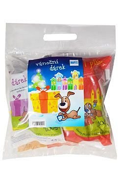 Mix pochoutek pro větší psy ve vánočním balení. Mimo etiketu s vánočním motivem je taška průhledná, takže jsou jednotlivé balíčky vidět. V tašce jsou čtyři balíčky z následujících balíčků: mušle, dárek, ouška a plíce