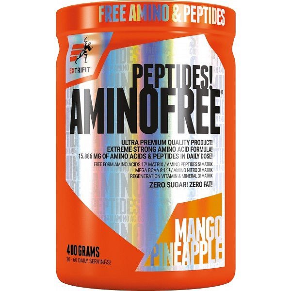 AminoFree Peptides je absolutní světová špička v aminokyselinových suplementech. Jedná se o vůbec nejčistší, nejrychlejší a nejlépe vstřebatelnou formu základních stavebních kamenů lidské svalové hmoty. Extrifit vyvinul zcela výjimečný produkt, který je složen z vysoce kvalitních a velmi drahých komponent. Aktuálně ve světě aminokyselin a peptidů nic lepšího, čistšího ani rychlejšího pro růst svalů a svalovou regeneraci neexistuje. Jedná se o sofistikovanou kombinaci výhradně volných (free form) aminokyselin v plném aminospektru s naprosto novou a revoluční formou značkových peptidů PepForm. Tyto patentované peptidy jsou v produktu zastoupeny v masivní míře a jedná se o peptidy těchto nejdůležitějších aminokyselin: arginin PepForm, glutamin PepForm, leucin PepForm, isoleucin PepForm, valin PepForm.