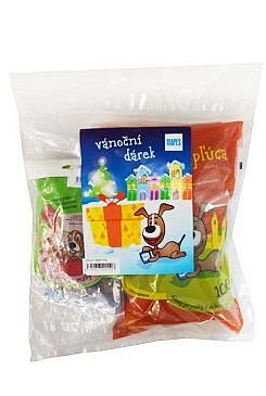 Mix pochoutek pro malé psy ve vánočním balení. Mimo etiketu s vánočním motivem je taška průhledná, takže jsou jednotlivé balíčky vidět. V tašce jsou čtyři balíčky z následujících balíčků: placičky, plíce, játra, zlomky