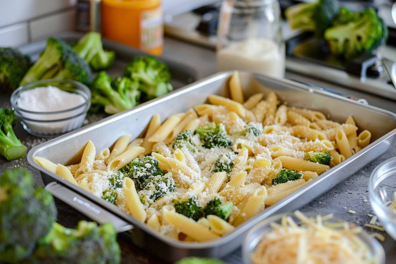 Ve větší míse smícháme uvařené těstoviny, brokolici a smetanovou omáčku. Polovinu sýra nastrouháme a vmícháme do směsi.